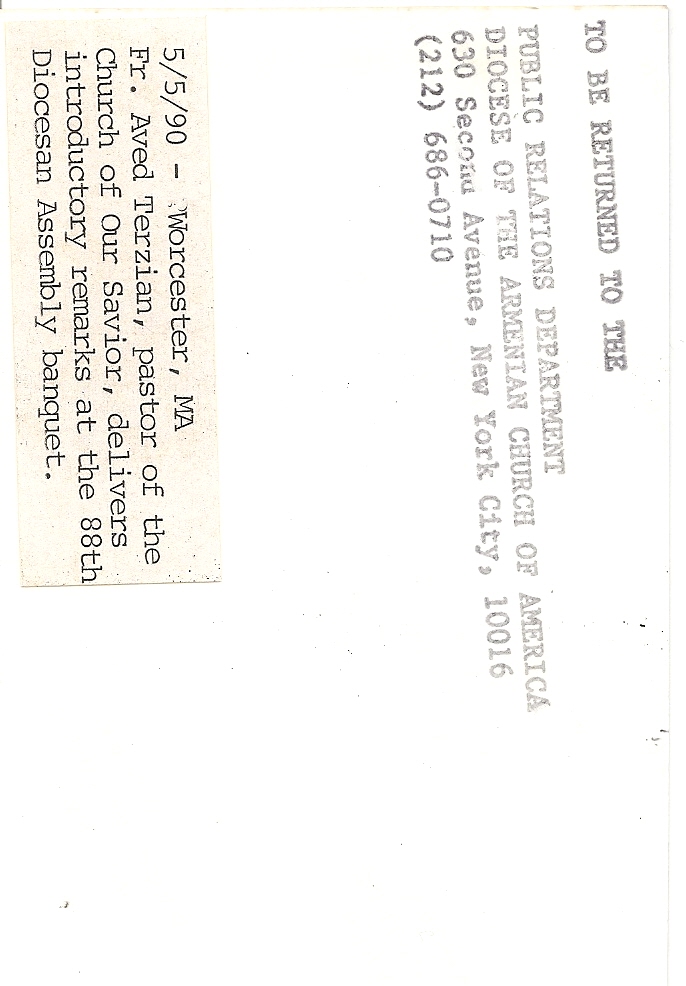 Summary: Father Aved Terzian delivers introductory remarks at 88th Annual Diocesan banquet. Back end of photo.