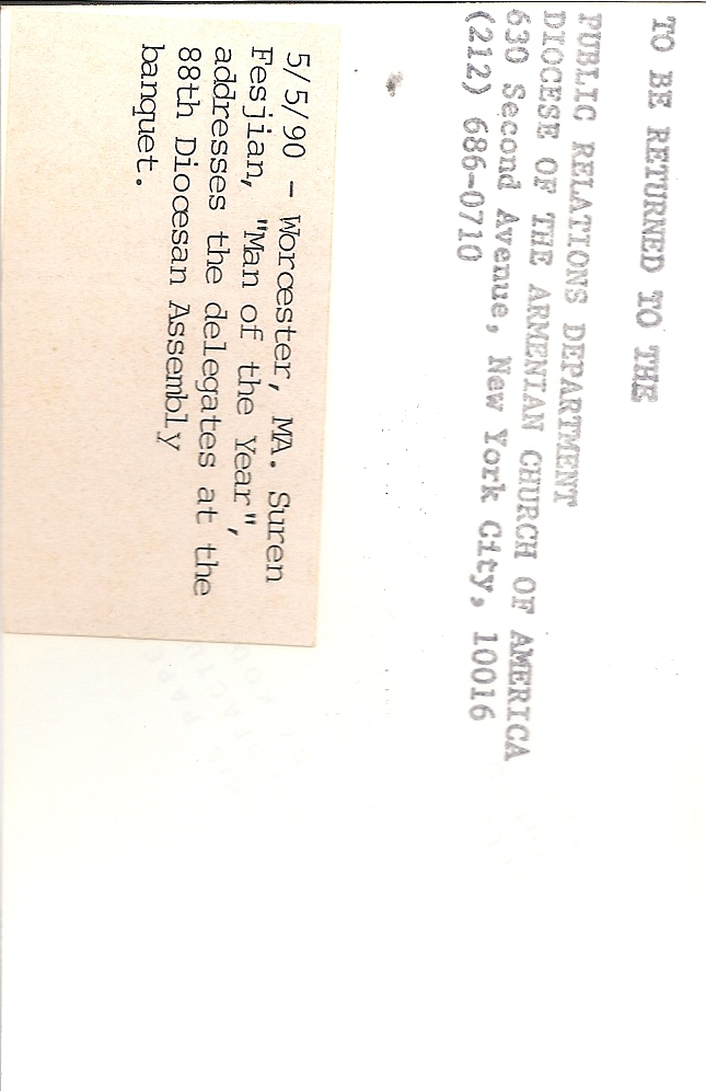 Biographical or Historical Data: Photo taken on May 5th 1990. MA. Suren Fesjian addresses delegates.