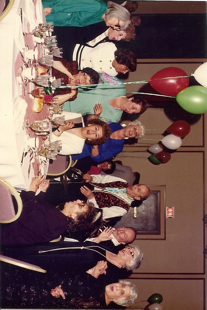 Summary: Delegates and friends enjoying the food and festivities. Front end of photo.