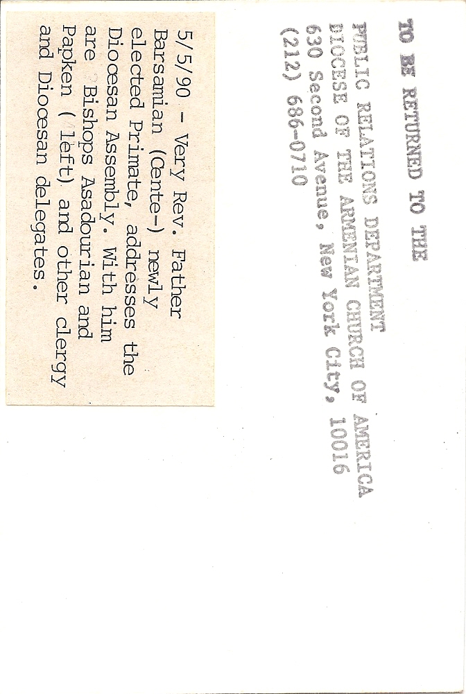 Summary: Very Rev. Father Barsamian addresses the Diocesan Assembly. Back end of photo.