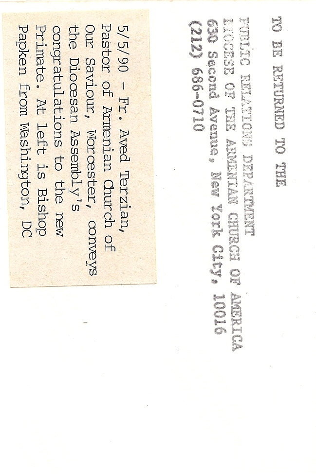Summary: Fr. Aved Terzian congratulates the new Primate. Back end of photo.