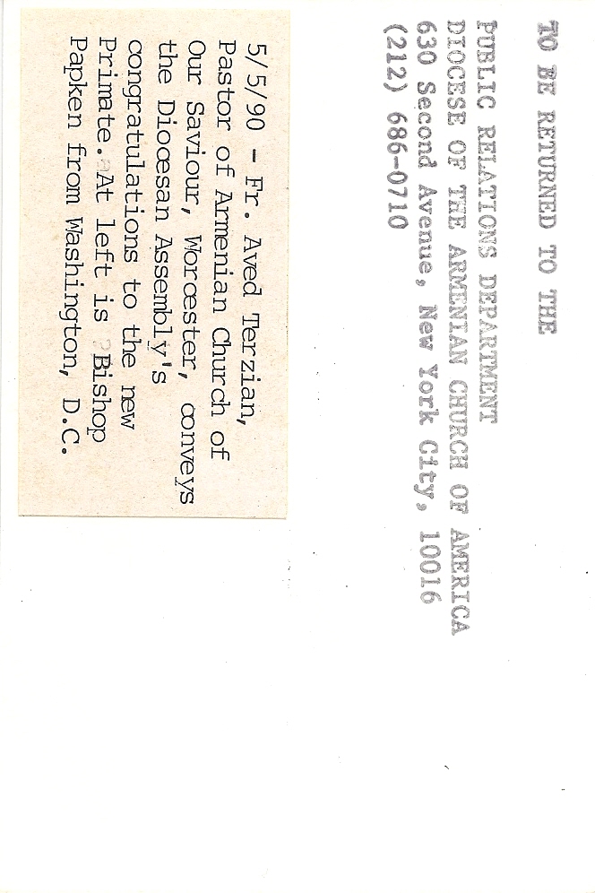 Biographical or Historical Data: Photo taken on May 5th 1990. Bishop Papken also in photo.