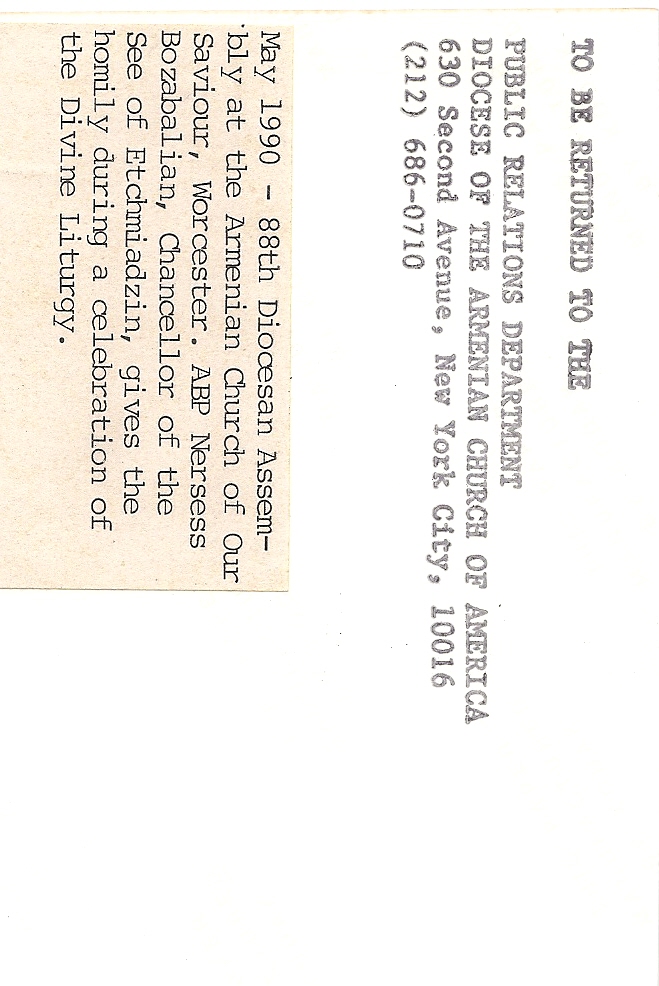 Summary: Archbishop Bozabalian, Chancellor of the See of Etchmiadzin, gives the homily during a celebration of the Divine Liturgy. Back end of photo.