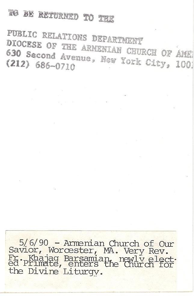 Summary: Fr. Khajag Barsamian, the newly elected Primate, enters the church for the Divine Liturgy. Back end of photo.