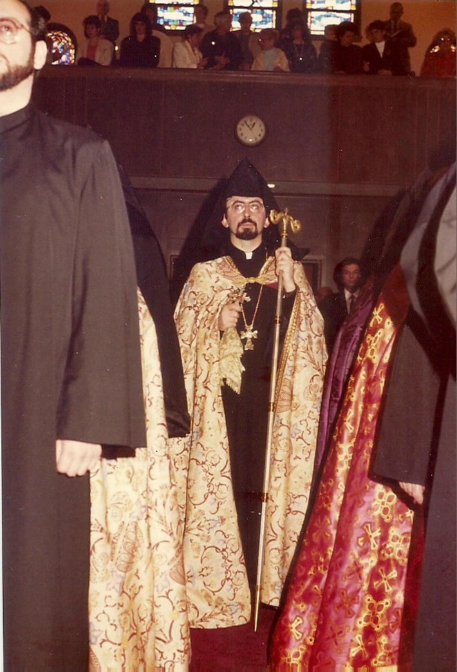 Summary: Fr. Khajag Barsamian, the newly elected Primate, enters the church for the Divine Liturgy. Front end of photo.