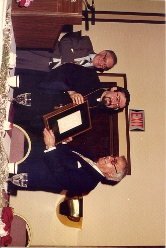 Summary: Suren Fesjian accepts the 'Man of the Year' award from Fr. Khajag Barsamian at the Diocesan Assembly banquet. Front end of photo.