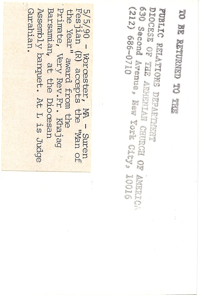 Summary: Suren Fesjian accepts the 'Man of the Year' award from Fr. Khajag Barsamian at the Diocesan Assembly banquet. Back end of photo.