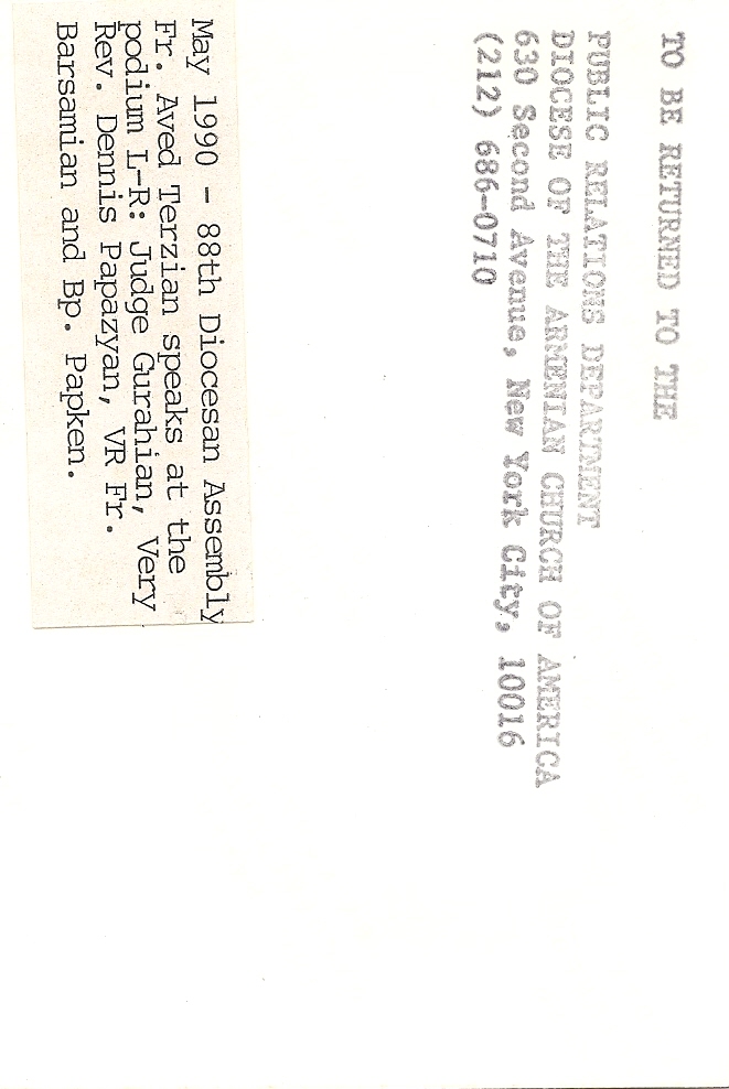 Summary: Fr. Aved Terzian speaks at the podium. 88th Diocesan Assembly. Back end of podium.