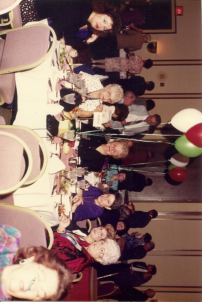 Summary: Delegates and friends enjoying the food and festivities during a break. Front end of photo.