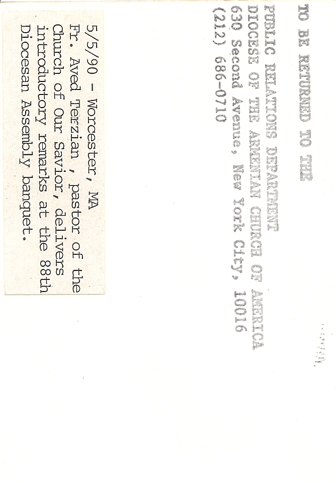 Summary: Fr. Aved Terzian, Pastor of the Church of Our Savior, delivers introductory remarks at the 88th Diocesan Assembly banquet. Back end of photo.