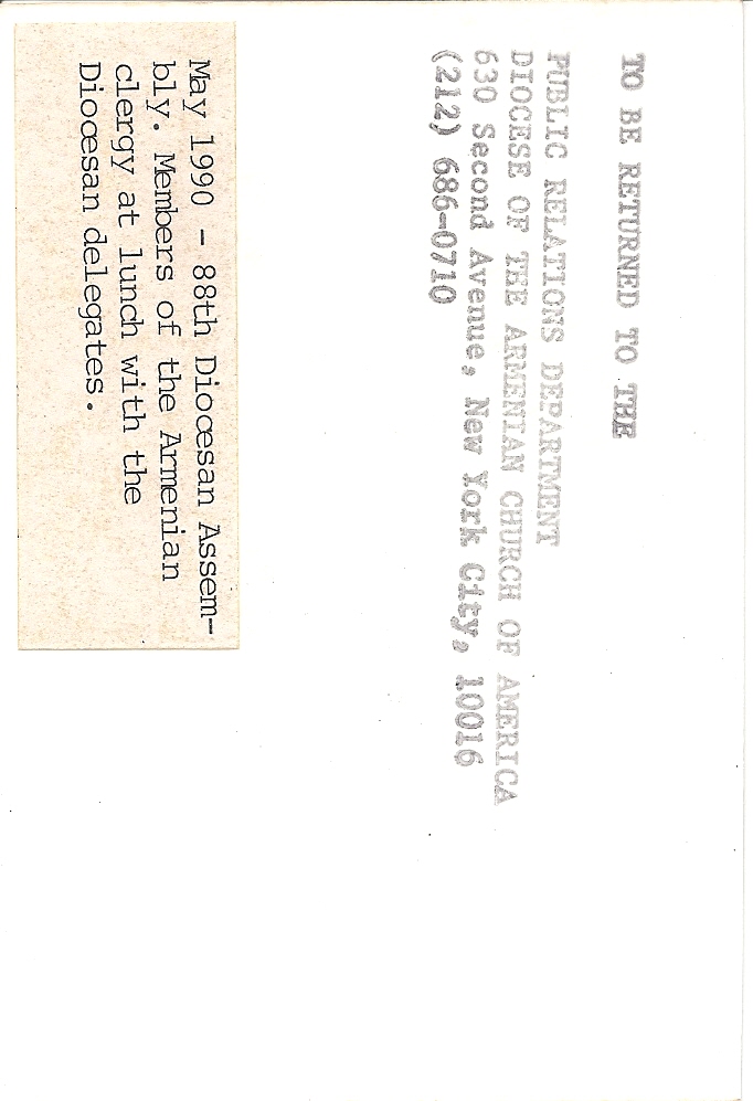 Summary: 88th Diocesan Assembly. Members of the Armenian clergy at lunch with the Diocesan delegates. Back end of photo.
