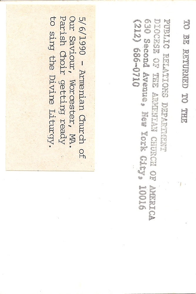 Summary: Armenian Church of Our Savior. Parish choir getting ready to sing the Divine Liturgy. Back end of photo.