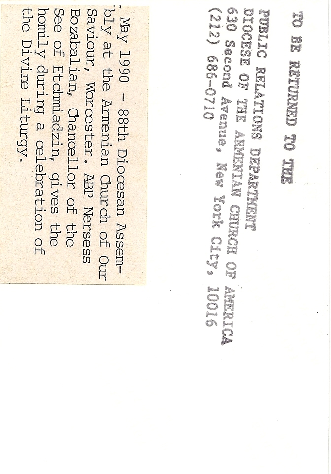 Biographical or Historical Data: Photo taken on May 1990 at the Armenian Church of Our Savior in Worcester, Massachusetts.