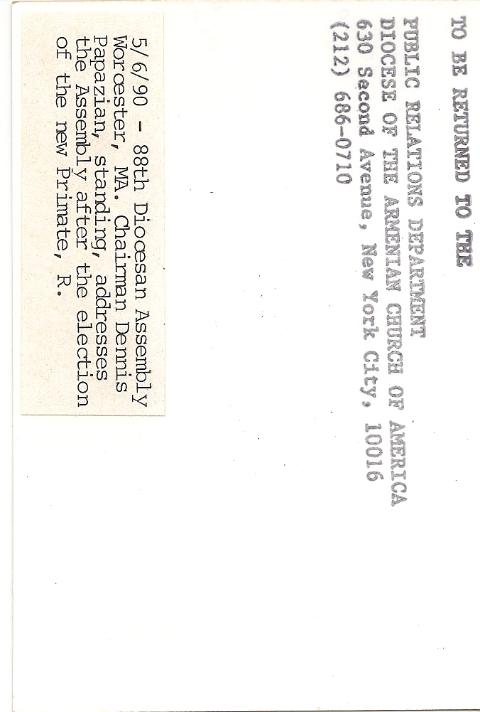 Biographical or Historical Data: Photo taken on May 6th 1990 at the 88th Diocesan Assembly in Worcester, Massachusetts.