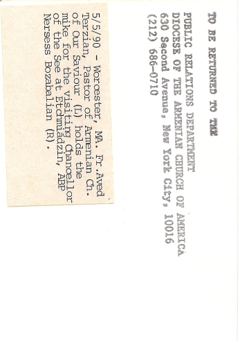 Summary: Fr. Aved Terzian, pastor of the Armenian Church of Our Savior, holds the mic for the visiting Chancellor of the See at Etchmiadzin, Archbishop Nersess Bozabalian. Back end of photo.