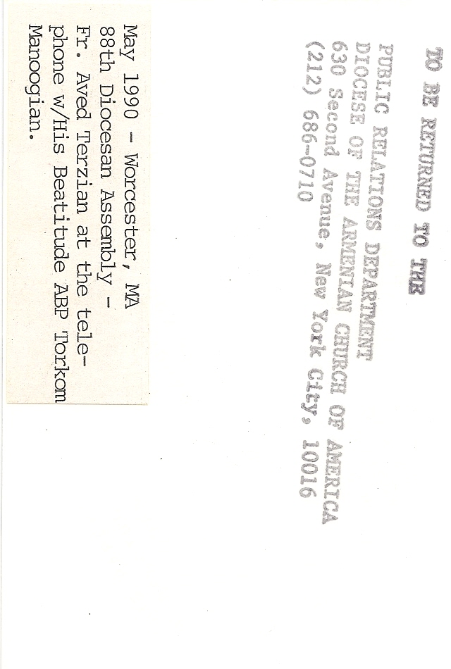 Summary: Father Aved Terzian at the telephone with this Beatitude Archbishop Torkom Manoogian. Back end of photo.