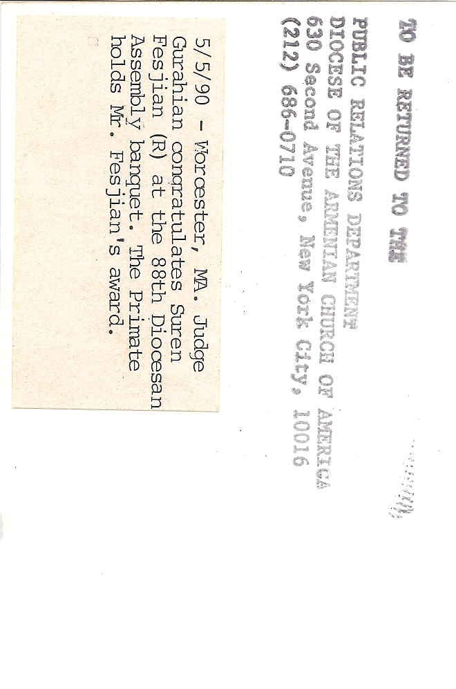 Summary: Judge Gurahian congratulates Suren Fesjian at the 88th Diocesan Assembly banquet. The Primate holds Fesjian's award. Back end of photo.