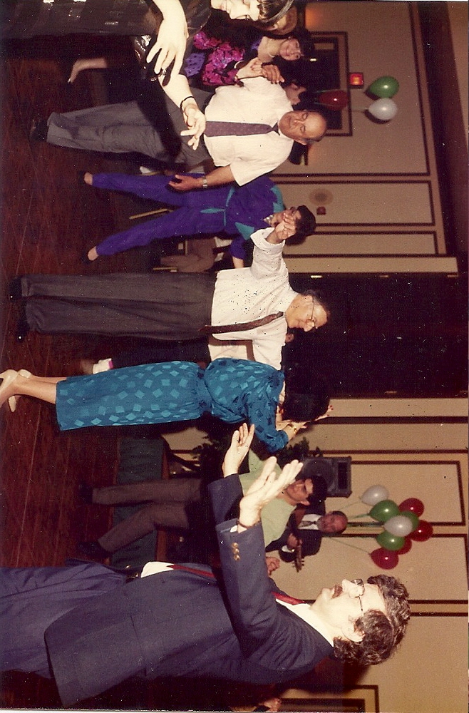 Summary: Delegates and friends dance to Armenian music at the 88th Diocesan banquet. Front end of photo.